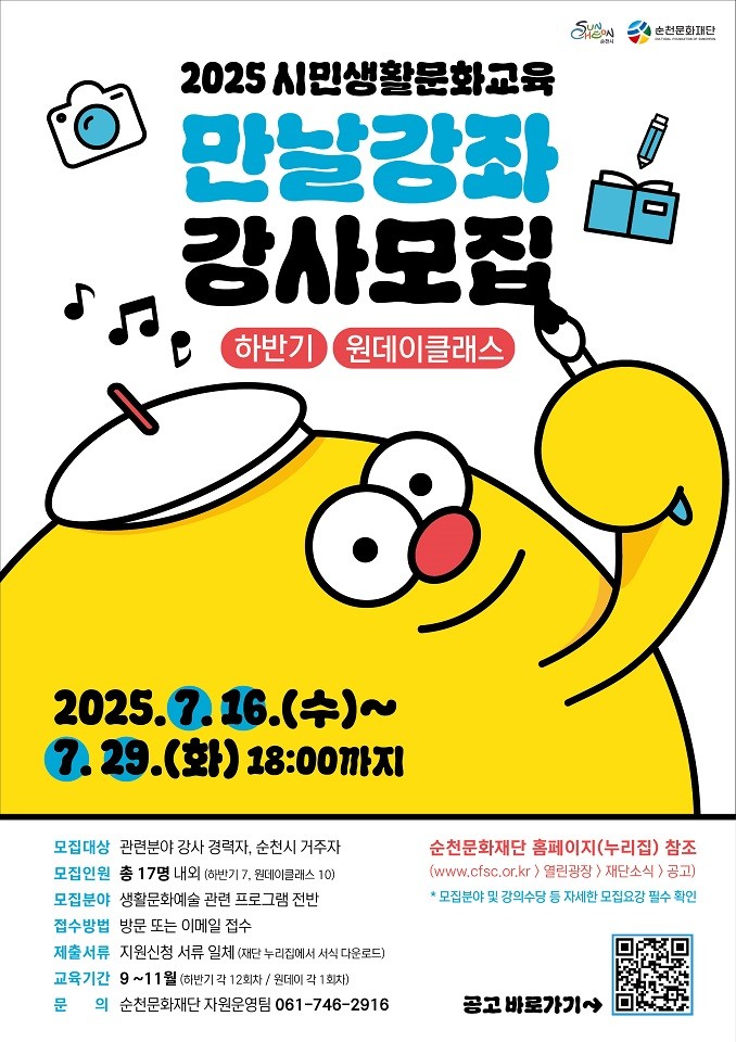 순천문화재단 관계자는 “수강생 모집은 8월 중순 진행될 예정이며, 순천시민이 일상 속에서 문화예술 향유 기회를 넓힐 수 있도록 지역 내 역량 있는 강사 분들의 많은 관심과 참여를 바란다”고 전했다.