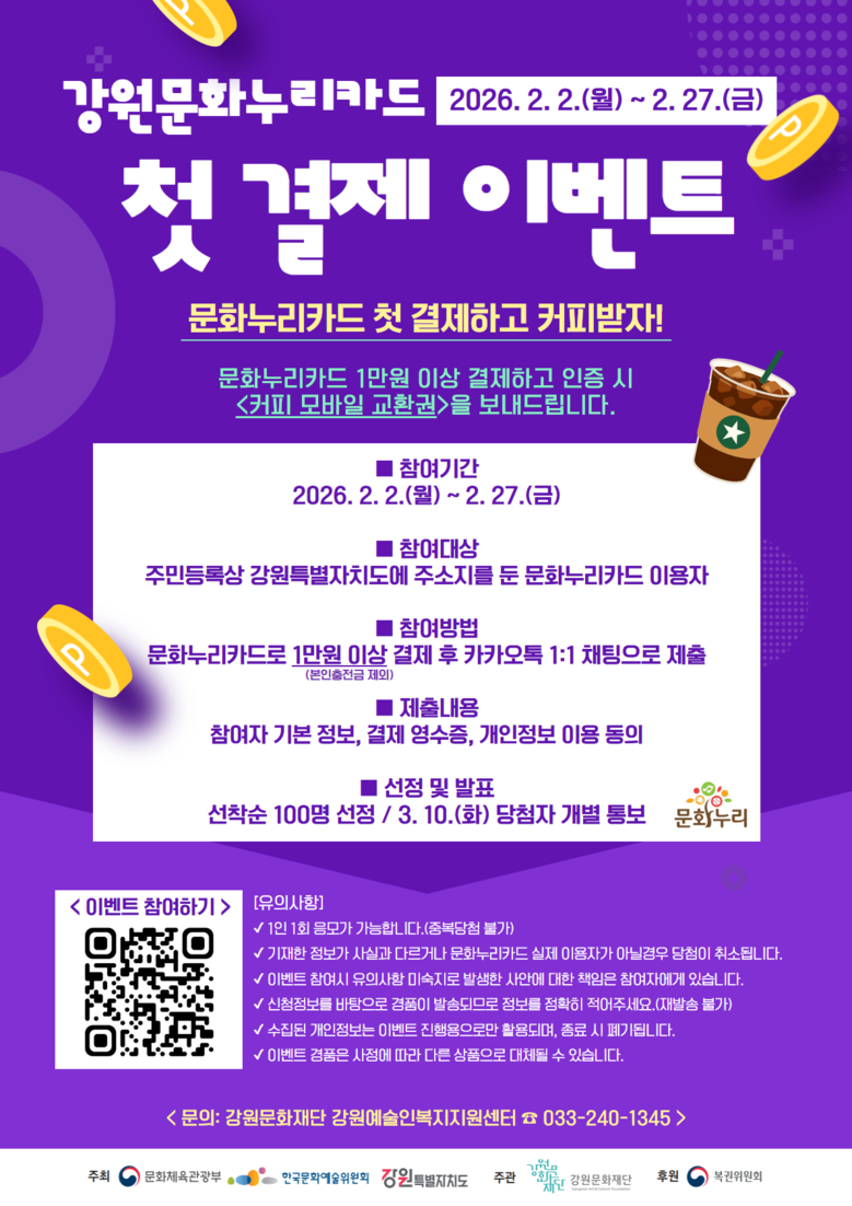 27일(금)까지 문화누리카드로 1만원 이상 결제한 영수증을 인증하면 선착순 100명에게 커피 모바일 교환권을 증정하며, 참여는 강원문화재단 문화누리 카카오톡 채널(pf.kakao.com/_xnYWvn)을 통해 할 수 있다.