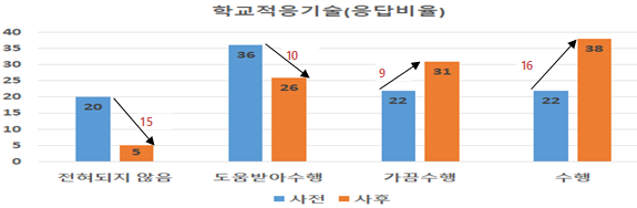 - 총 5개월간 연간 16회기로 진행, 수업시간 착석교육, 질서지키기, 쉬는 시간과 수업시간 구분하기, 교실이동하기, 학교시설이용, 과제하기 등 학교적응 기술향상, 부모 자조모임, 가족프로그램 및 사회적응프로그램을 실시해 오고 있음 (참고자료 2,3)
