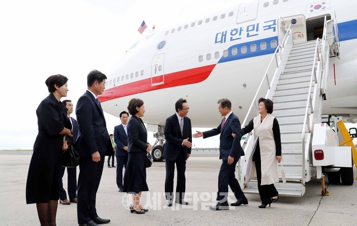 문재인 대통령과 부인 김정숙 여사가 18일(현지시각) 뉴욕 JFK 공항에 도착해 환영 인사들과 인사하고 있다. 2017.09.18.
