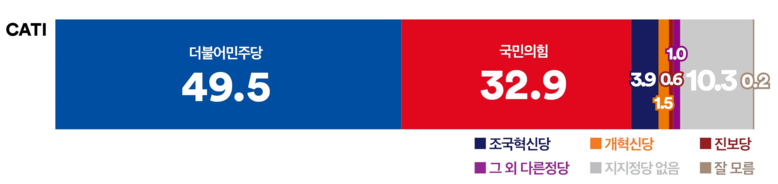 권역별로 살펴보면, ‘더불어민주당’은 호남권에서 72.3%의 압도적인 지지를 얻었으며, 서울(47.7%),경인권(53.6%), 충청권(49.2%)에서도 ‘국민의힘’을 앞섰다. 반면, ‘국민의힘’은 대구·경북에서 54.1%의 지지를 얻으며 강세를 보였다.