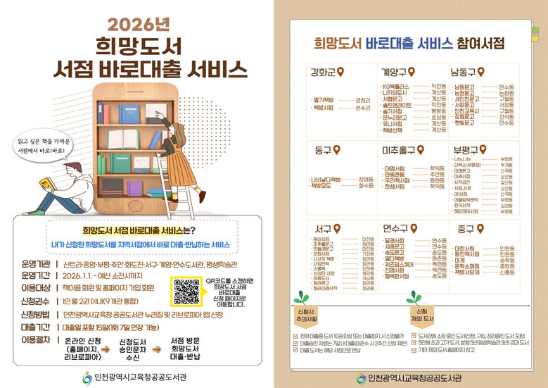 이용을 원하는 시민은 인천시교육청 누리집이나 모바일 앱 ‘리브로피아’에서 대출 도서와 방문할 서점을 지정해 신청할 수 있으며, 자세한 내용은 인천시교육청 산하 공공도서관(신트리·중앙·부평·주안·화도진·서구·계양·연수)이나 평생학습관으로 문의하면 된다.