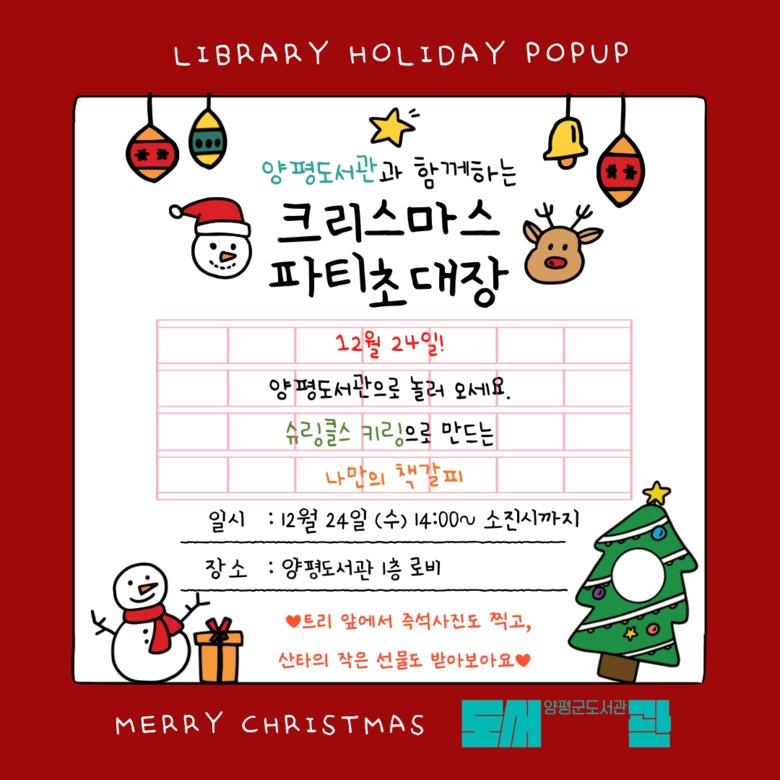 이경희 평생학습과장은 “이번 크리스마스 체험행사를 통해 도서관이 지역 주민이 함께 문화를 즐기는 생활문화 공간으로 자리매김하고 있음을 확인했다”며 “앞으로도 다양한 문화 프로그램을 통해 군민의 문화 향유 기회를 지속적으로 확대하겠다”고 말했다.