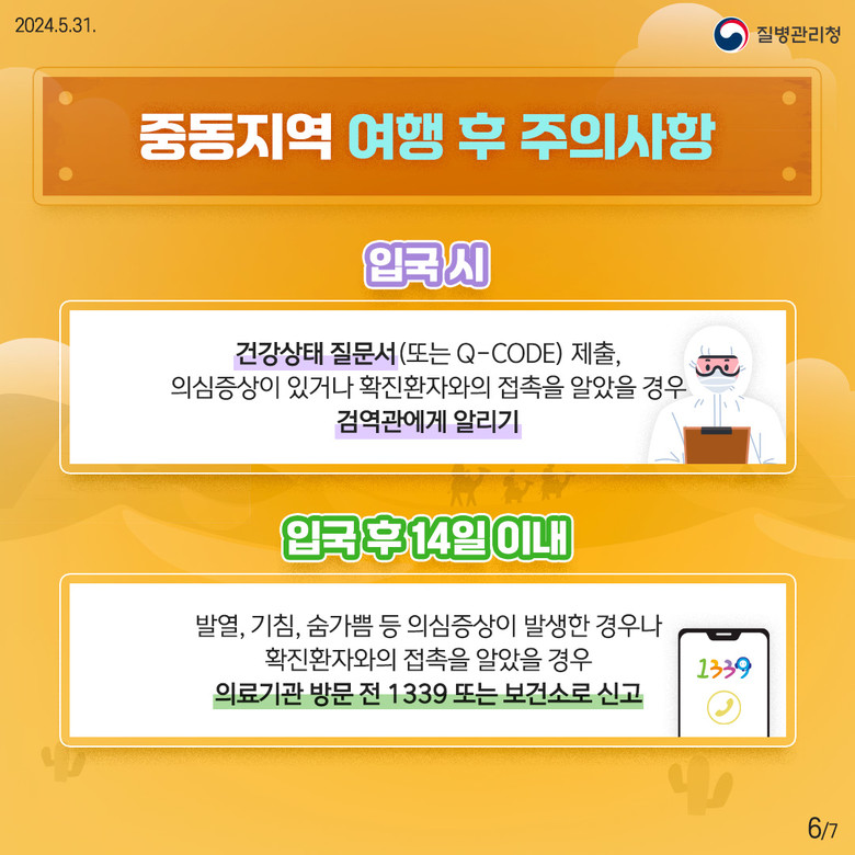 중동지역(메르스 중점검역관리지역, 13개국)을 체류한 경우 입국 시 Q-CODE (검역정보 사전입력시스템) 또는 건강상태질문서를 통해 반드시 건강 상태를 신고해야 하며, 귀국 후 14일 이내 발열 및 호흡기증상 발생시에는 질병관리청 콜센터(1339)에 신고해야 한다.