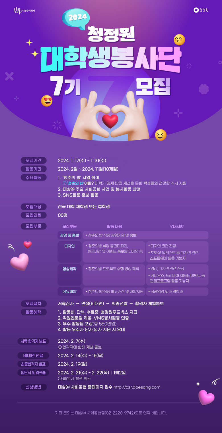 ‘청정원 대학생 봉사단’ 7기는 대학생이라면 재학생, 휴학생 관계없이 누구나 대상㈜ 사회공헌 홈페이지를 통해 이달 31일까지 지원할 수 있다. 합격자는 내달 19일 개별 통보할 예정이며, 합격자를 대상으로 2월 21일부터 22일까지 입단식 및 워크숍을 진행한다.