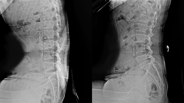 | ▲보통 의자에 앉은 자세(좌)와 자생 맞춤미학 허리쿠션을 착용하고 앉은 자세(우)를 비교한 엑스레이(X-ray) 사진 |