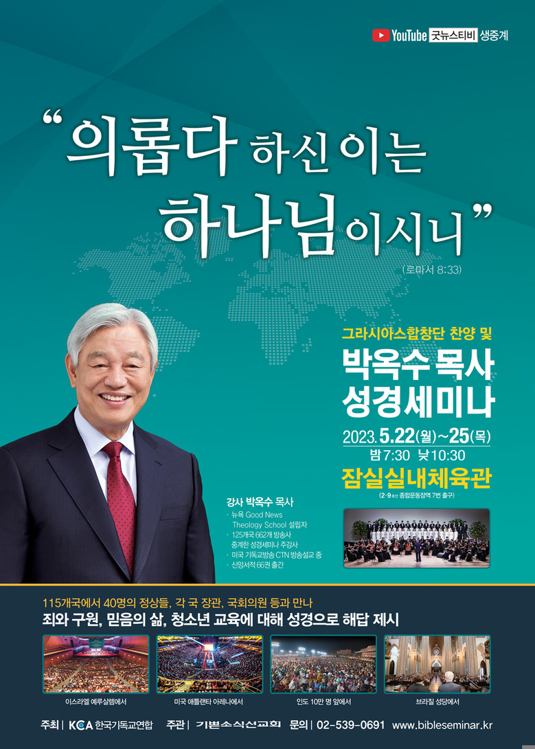 한국기독교연합(KCA)이 주최하고 기쁜소식선교회가 주관하는 이번 박옥수 목사 성경세미나는 광주(3~6일)와 인천(7~10일), 대전(11~13일), 대구(14~17일)에 이어 22일(월)부터 25일(목)까지 서울 잠실실내체육관에서 열리며 2023년 상반기 일정을 마무리한다.