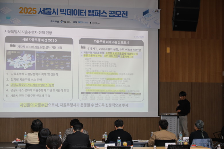 [서울 세계타임즈=이장성 기자] 서울시는 교통·생활 인프라와 행정통계 데이터를 종합 분석해 자율주행버스의 최적 운행 경로와 정류장 입지를 도출한 ‘GeoPath’ 팀이 「2025 서울시 빅데이터캠퍼스 공모전」의 대상을 차지했다고 밝혔다.