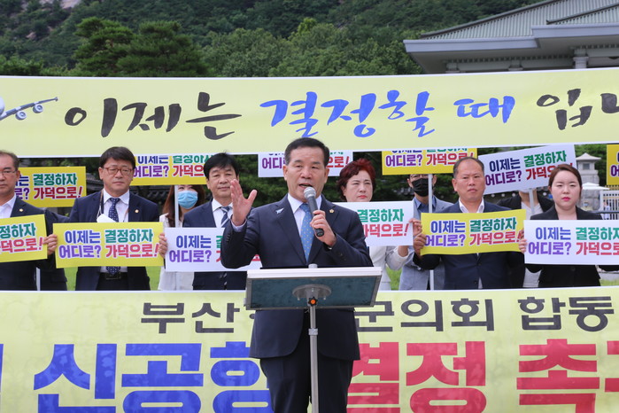 또 김진 수영구의회 의장도 구·군의회를 대표해 “지난 20여년간 제대로 된 신공항 하나만을 염원했지만 수도권 일극체제에 밀려 현재까지도 꿈으로만 남아있다”고 말하고 “공정하고 신속한 검증을 통해 김해공항 확장은 안 된다는 결론을 내고 안전하고 24시간 운영가능한 가덕신공항을 조속히 결정해 줄 것”을 촉구했다.