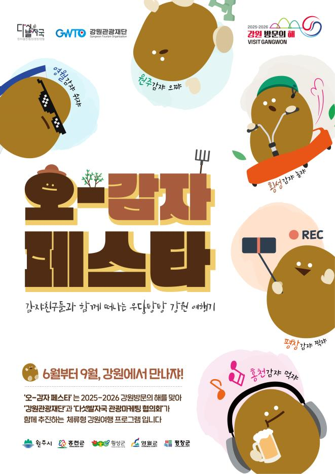 [강원도 세계타임즈=김민석 기자] 강원관광재단(대표이사 최성현, 이하 재단)은‘2025-2026 강원 방문의 해’를 맞아 영서 내륙 5개 시군과 함께, 다섯발자국 공동 홍보 마케팅 사업의 일환으로 새로운 체류형 관광 상품 세 번째‘오감자 페스타’를 8월 8일(금)~10일(일) 홍천에서 개최한다고 밝혔다.