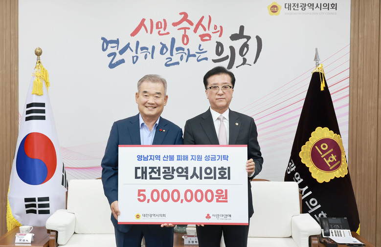 조원휘 의장은 “이 성금이 피해 지역의 재건과 이재민 여러분들의 피해 복구에 작은 보탬이라도 되기를 진심으로 바란다”며, “앞으로 대전시의회는 지역사회에 도움이 될 수 있는 나눔 활동을 지속적으로 펼치겠다”고 밝혔다.