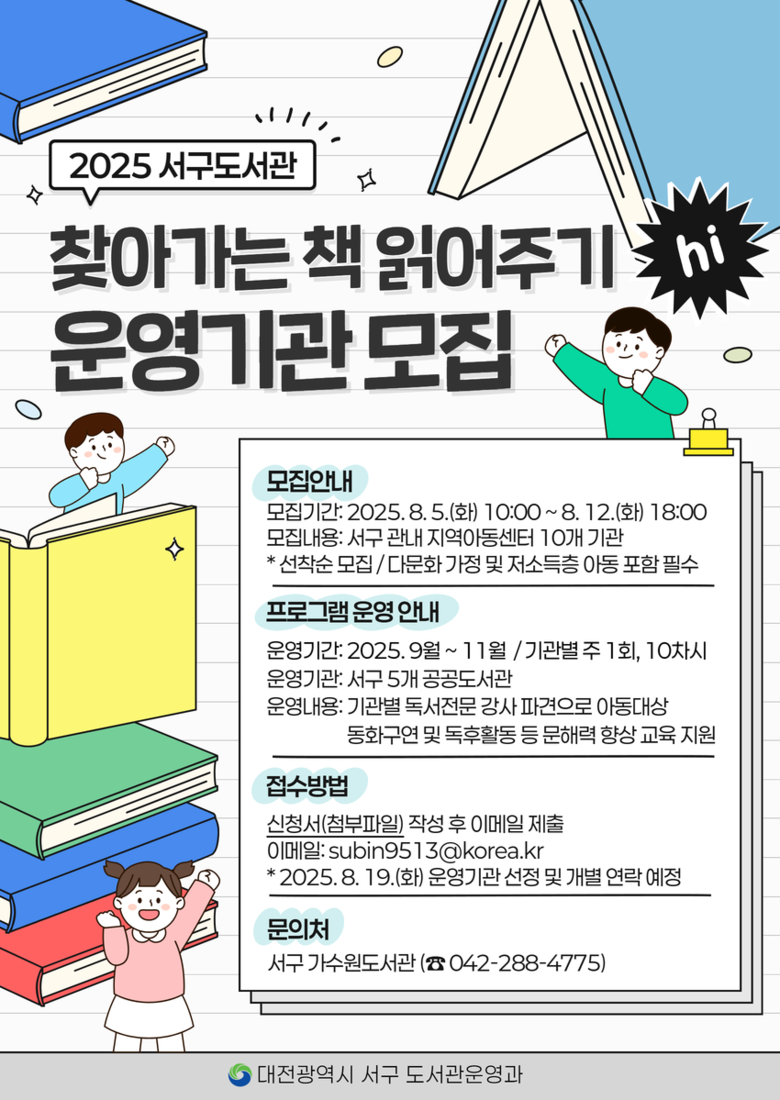 참여를 희망하는 지역아동센터는 8월 5일 오전 10시부터 12일 오후 6시까지 서구도서관 홈페이지에서 신청서를 내려받아 작성한 뒤, 담당자 이메일로 제출하면 된다. 신청 기관은 다문화 또는 저소득층 가정 아동을 포함해야 하며, 다문화가정 아동이 있는 기관에 우선 참여 기회를 부여한다.
