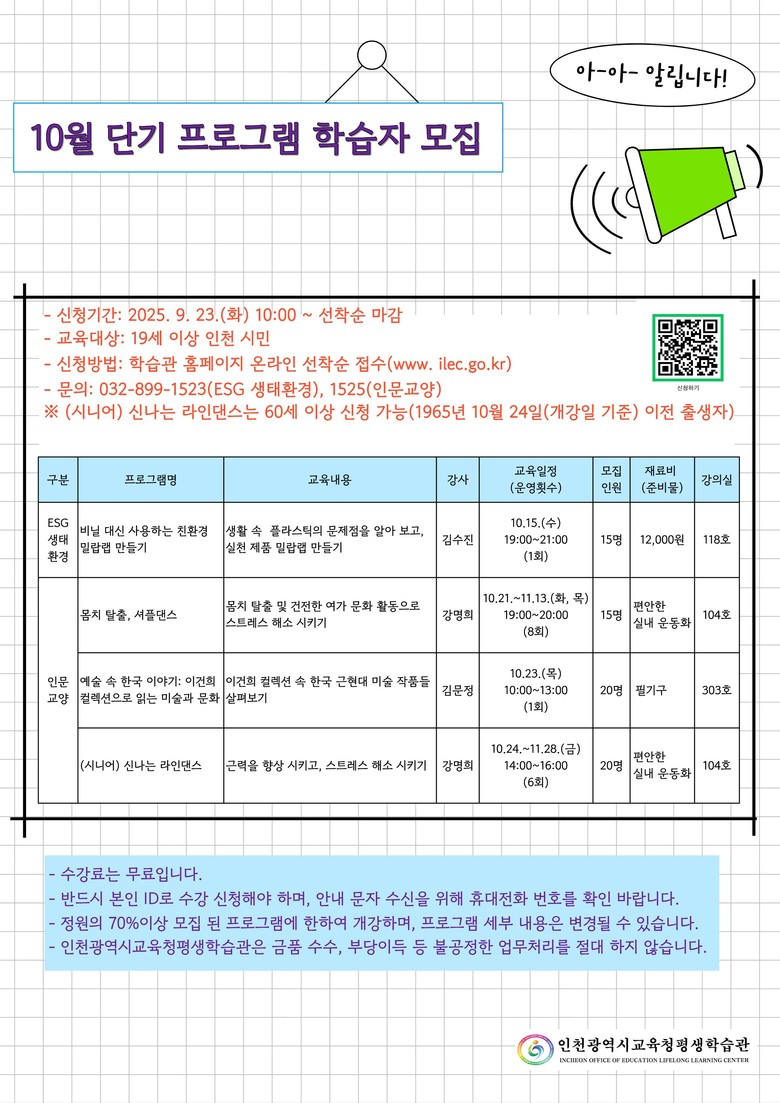 참가 신청은 9월 23일 오전 10시부터 평생학습관 누리집(https://www.ilec.go.kr/)에서 가능하며, 문의는 평생교육부(☎032-899-1523, 1525)로 하면 된다.