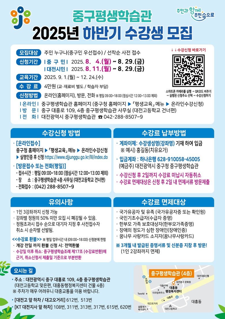강의 일정, 교육 내용 및 수강신청 등 사항은 중구 평생학습관 누리집(https://www.djjunggu.go.kr/lll/index.do) 또는 중구 평생학습관(☎042-288-8508~9)으로 문의하면 된다.