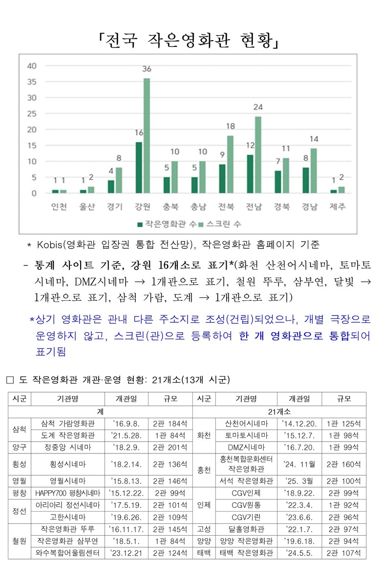 김광철 강원특별자치도 문화체육국장은 “작은영화관 조성을 통해 도민들에게 더욱 풍부한 문화적 혜택을 제공하고, 지역 경제에도 긍정적인 영향을 미치고 있다”며, “앞으로도 도민들의 문화 향유권 증진과 지역 상권 활성화를 위해 지속적으로 노력하겠다”고 밝혔다.
