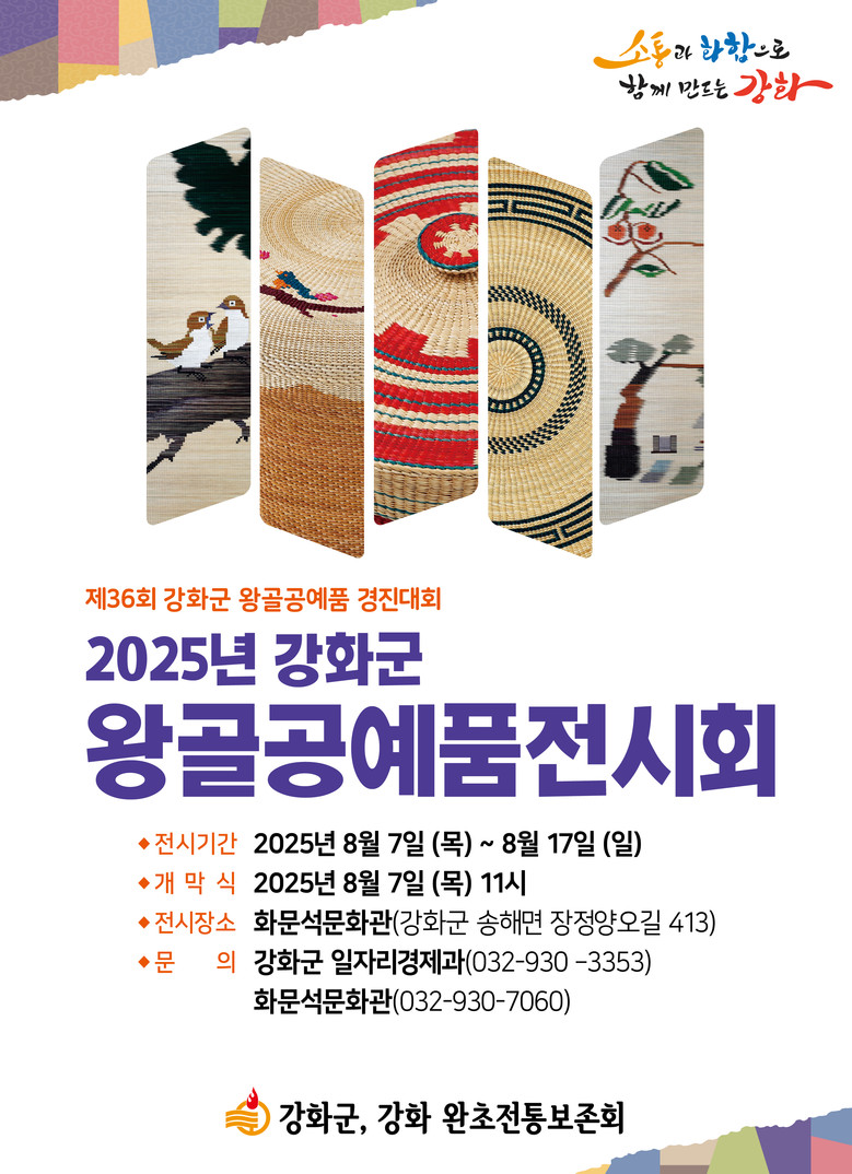 경진대회 입상작 등 다채로운 왕골공예 작품 전시 [강화군 세계타임즈=심하린 기자] 강화군(군수 박용철)이 오는 7일부터 17일까지 화문석문화관에서 ‘2025년 강화군 왕골공예품 전시회’를 개최한다.