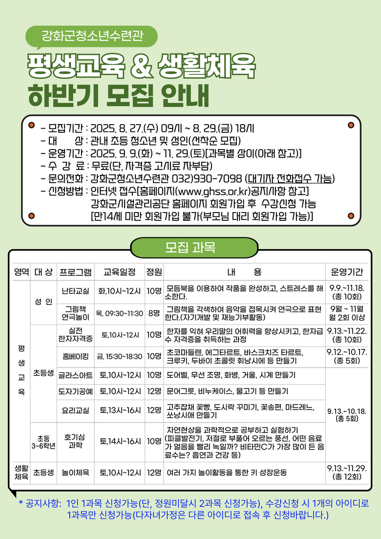 관내 초등 청소년 및 성인 대상 무료 신청 [강화군 세계타임즈=심하린 기자] 강화군시설관리공단(이사장 박영길) 청소년수련관은 오는 27일~29일까지 하반기 평생교육과 생활체육 프로그램 참가자를 모집한다고 밝혔다.