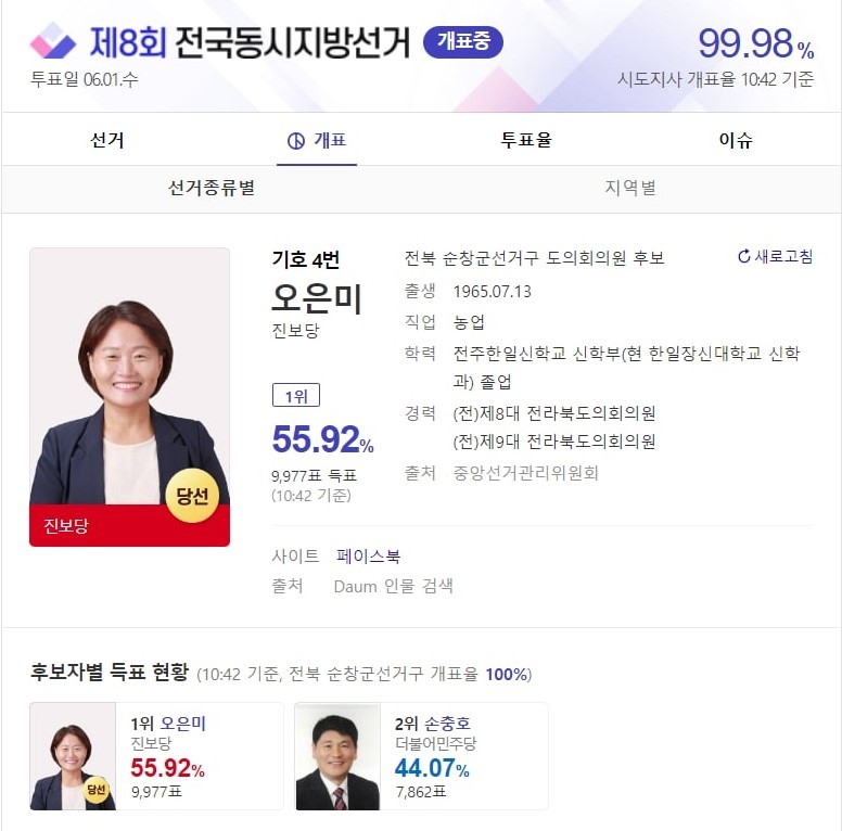 [세계타임즈 백진욱 기자] 진보당 오은미 후보가 제 8회 전국동시지방선거 전북 순창군선거구에서 도의회의원으로 당선됐다.