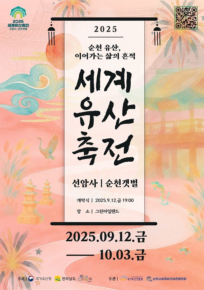 한편, 「2025 세계유산축전 선암사, 순천갯벌」은 9월 12일 그린아일랜드 개막식을 시작으로 10월 3일까지 22일간 선암사와 순천갯벌 일원에서 펼쳐진다. 모든 세대가 함께 참여할 수 있는 AR.VR 실감형 공연 프로그램인 ‘만일의 수행’, ‘갯벌의 사계’를 비롯해 산사에서의 하룻밤, 순천만습지 갈대 백패킹, 세계유산 버스투어 등 다양한 프로그램이 운영될 예정이다. 이를 통해 세계유산도시 순천의 가치를 국내외에 널리 알릴 계획이다.