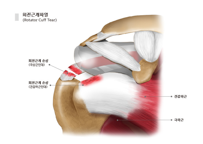 회전근개란 어깨 관절을 덮고 있는 4개의 근육으로, 어깨 관절의 안정성을 유지해주는 역할을 한다. 회전근개가 손상을 입게 되면 어깨 통증과 결림이 느껴짐과 동시에 근력이 감소하고 관절 가동범위가 크게 줄어들게 된다. 움직일 때 삐걱거리는 소리가 나기도 한다.