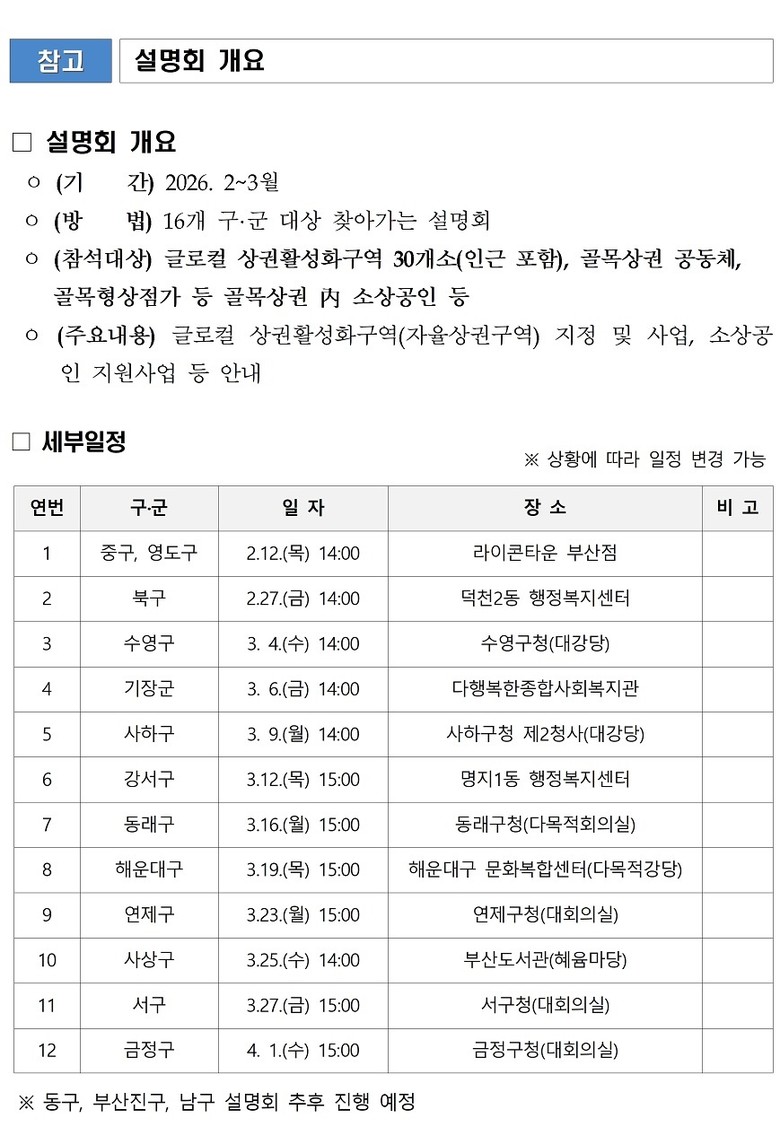 설명회 세부 일정은 부산소상공인종합지원센터(bsbsc.kr) 공지사항에서 확인할 수 있다.