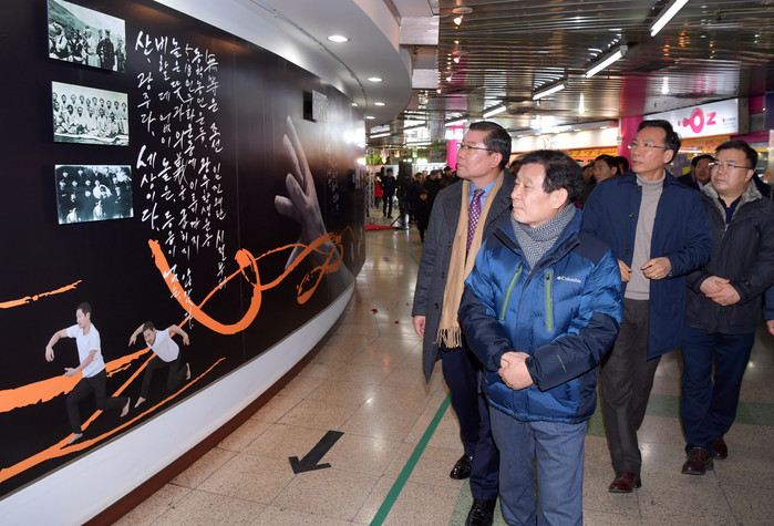 [광주=세계타임즈 양준호 기자]윤장현 광주광역시장이 16일 오후 동구 금남지하상가 만나의 광장에서 열린 광주프린지페스티벌 시각조형물 '광주판테온(가칭)'제막행사에 참석해 이은방 광주시의회 의장, 조세철 부의장 등 내빈들과 작품을 둘러보고 있다. 금남로 지하상가 분수대 주변 원통 외벽 73m 구간에 세워진 광주판테온(가칭)은 서로 맞잡고 있는 손과 빛의 이미지를 결합한 후 광주 역사적 사진과 인물, 광주의 일상적 사진 등이 담겨져 있다./광주광역시 제공