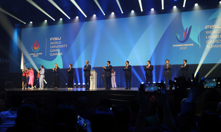 깃발 이양식은 라인루르에서 다음 개최지인 충청권으로 대회기를 넘기는 의식으로, 김 지사와 이장우 대전시장, 최민호 세종시장, 김영환 충북도지사, 강창희 2027 충청 유니버시아스대회 조직위원회 위원장이 함께 깃발을 인수받았다.
