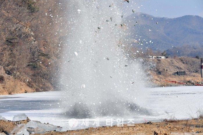 9일 강원 홍천군 홍천강 일대에서 육군 제11기계화보병사단 장병들이 동계 파빙 도하훈련에 앞서 TNT폭약으로 얼어붙은 강을 깨고 있다. 2017.02.12.