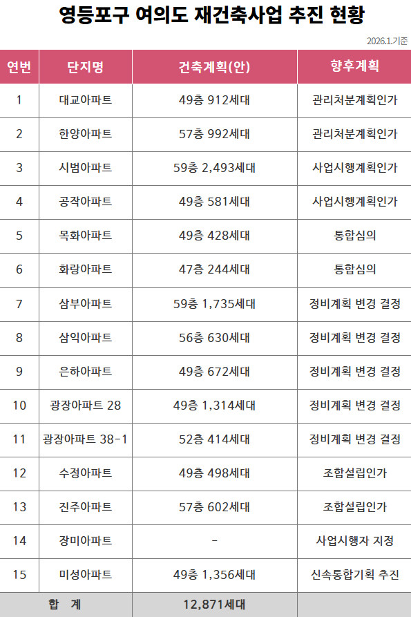 최호권 영등포구청장은 “핵심 업무지구인 여의도의 재건축사업은 주거와 업무, 상업 기능이 조화를 이루는 도시로 나아가는 중요한 전환점”이라며 “각 단지의 추진 단계에 맞춰 사업이 안정적으로 진행될 수 있도록 행정 지원을 이어가겠다”라고 전했다.