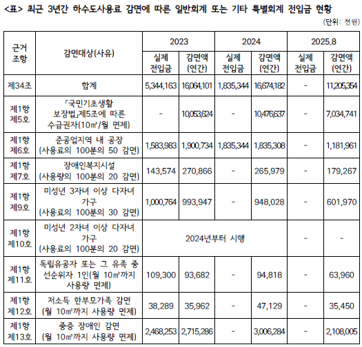 서울시가 제출한 감사자료에 따르면, 최근 3년간 하수도 사용료 감면액은 2023년 160억, 2024년 167억, 2025년 8월 기준 112억으로 매년 증가한 반면,