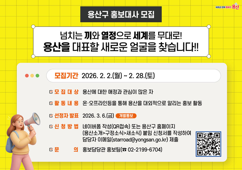 박희영 용산구청장은 “이번 주민‧시민 홍보대사 운영은 주민이 직접 참여하고 소통하는 체감형 홍보의 출발점이 될 것”이라며 “용산구의 가치와 매력을 함께 높여갈 열정 있는 분들의 많은 참여를 바란다”고 말했다.