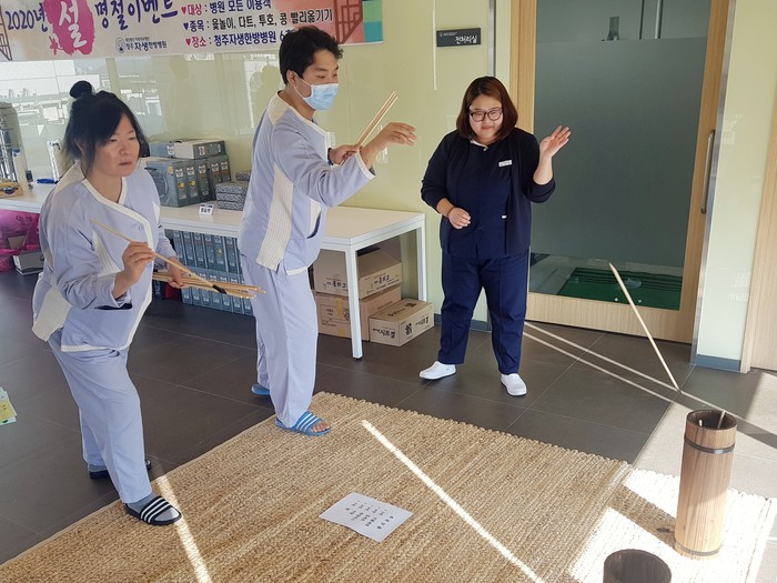 | ▲청주자생한방병원 환자들이 설 맞이 행사에 참가해 투호를 즐기고 있다. |