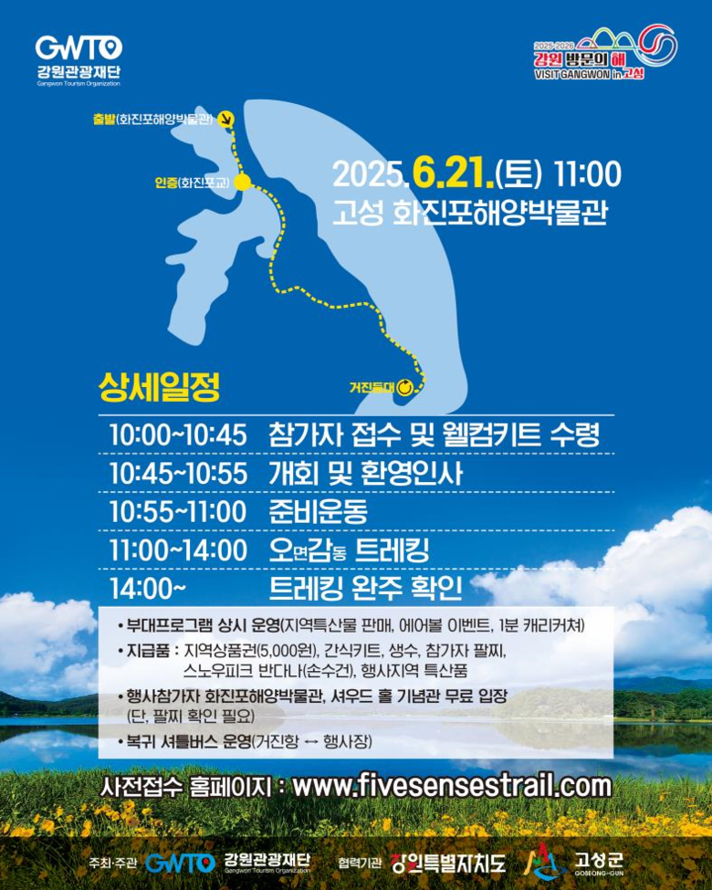‘오감 트레킹’ 걷기 코스를 지역 시장과 연계해 지역 먹거리를 맛보며 입맛을 돋운다. 행사장에는 고성 특산물 판매 부스, 다양한 체험 부스, 화진포 해양박물관이나 셔우도 홀 기념관 무료 입장 등 특별한 경험을 선사해 줄 이벤트를 마련하여 더욱 풍성하게 참가자들에게 즐거움을 더할 예정이다.