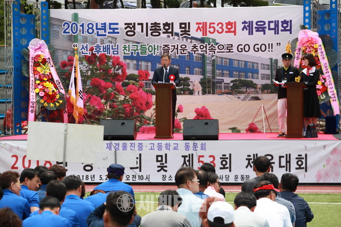 울진중.고등학교 총문회장 장진창 총동창회장이 격려사 하고 있다.사진=이연종기자