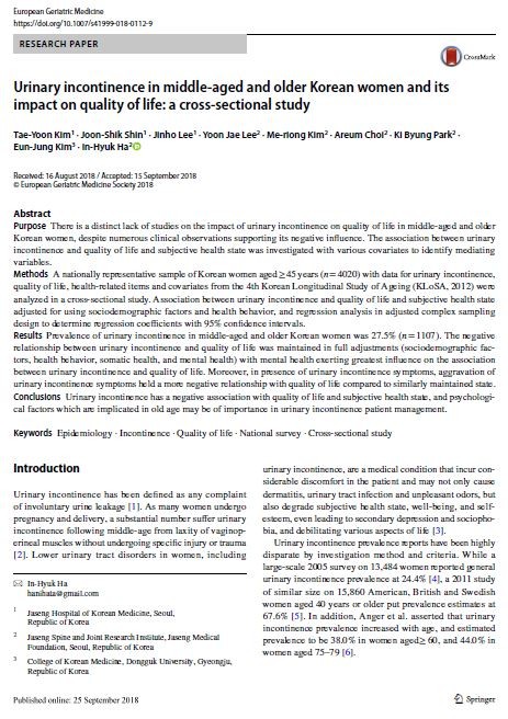 | ▲SCI(E)급 국제학술지 ‘European Geriatric Medicine’ 9월호에 게재된 해당 연구 논문 「Urinary incontinence in middle-aged and older Korean women and its impact on quality of life: a cross-sectional study」 |