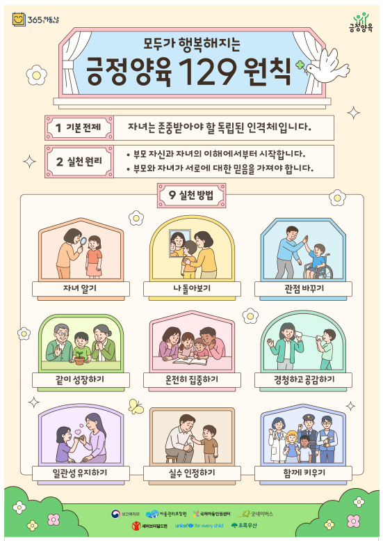 ‘긍정 양육’은 아이를 독립된 인격체로 존중하며, 부모와 자녀 간에 상호 소통과 이해, 신뢰를 바탕으로, 체벌 대신 긍정적인 방법으로 훈육하는 것을 말한다.