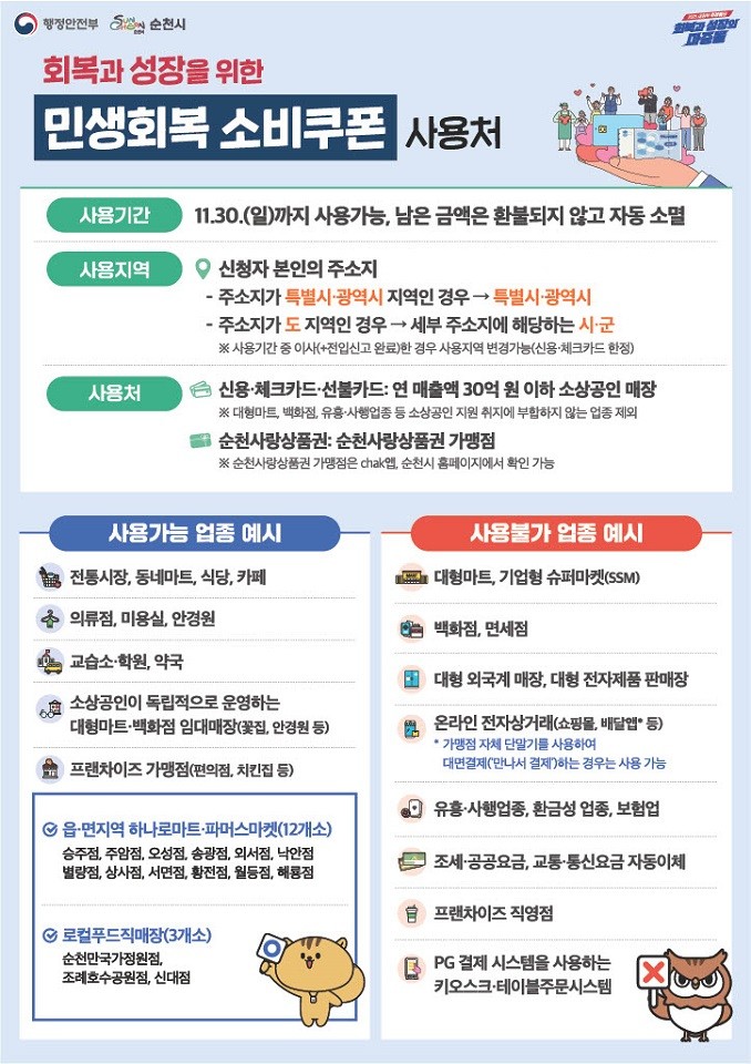 특히 2차 소비쿠폰은 사용 편의를 확대하기 위해 기존 사용처 외에도 읍·면 지역 하나로마트 및 파머스마켓(12개소)과 순천 로컬푸드 직매장(3개소)까지 이용 가능하도록 했다.