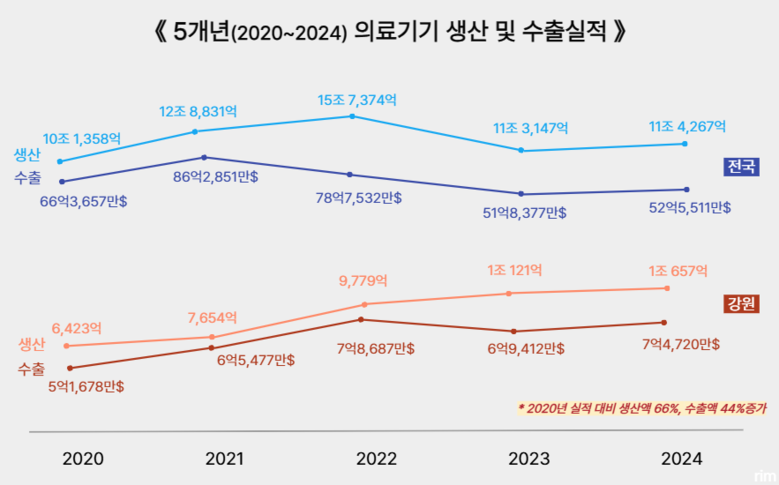 - 수출액뿐만 아니라 강원 의료기기 생산액은 같은 기간 6,423억 원에서 1조 657억 원으로 증가하며 연평균 13.5%의 높은 성장률을 기록했고, 전국 생산 비중도 9.3%로 확대됐다.