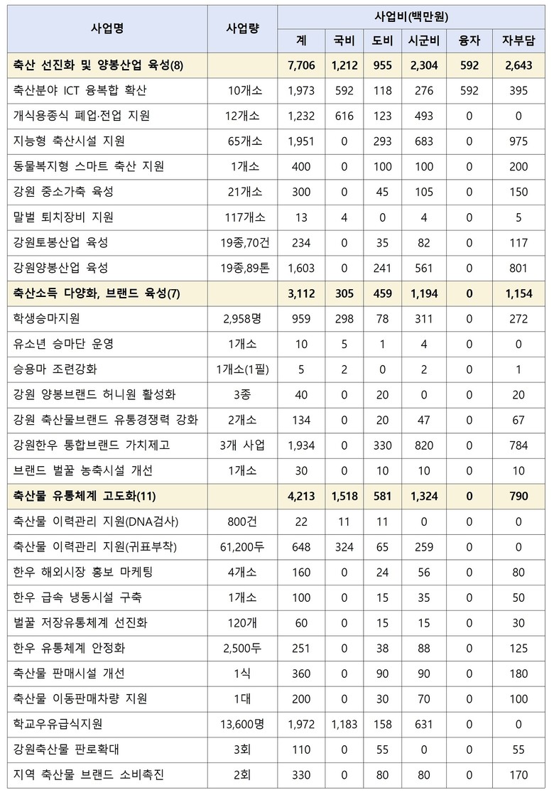 세부적으로는 한우 품질 고급화와 낙농산업 경영 안정 등 가축 개량 및 축산농가 경영 안정화를 위해 104억 원을 투입한다. 또한 조사료 운송비 지원과 조사료 유통센터 신축 등을 통해 안정적인 자급 조사료 생산체계를 구축하는 데 143억 원을 투자할 계획이다.