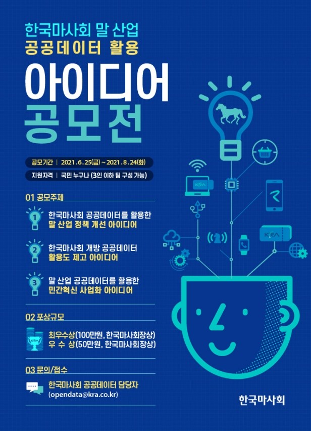 대한민국 국민이라면 누구나 참여할 수 있는 이번 공모는 개인 또는 3인 이하의 팀 단위로 참여할 수 있고 접수는 이메일(opendata@kra.co.kr)을 통해서만 가능하다.