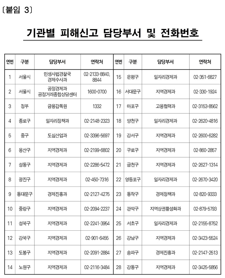 불법사금융 피해를 입었거나 관련 정보를 알고 있다면 서울시 응답소 홈페이지 내 ‘민생침해 범죄신고센터’, ‘공정거래종합상담센터’(☎1600-0700) 등으로 신고할 수 있다. 서울시는 공익증진에 기여한 제보자에게 심의를 거쳐 최대 2억 원까지 포상금을 지급하고 있다.