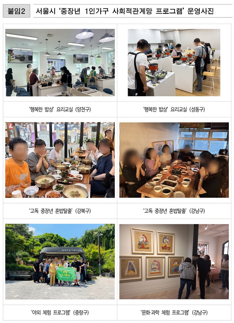 시는 올해 초, 중장년 1인가구가 증가하고 있으나 이들에 대한 정책적 지원은 부족하단 것에 착안해, 중장년 1인가구를 위한 사업을 강화하기로 했다. 이에 중장년층을 위한 식사모임 프로그램을 새롭게 시작했으며 참여 연령 또한 기존 64세에서 67세로 높였다. 또 일부 자치구에서 운영되던 프로그램을 전 자치구로 확대하여 보다 많은 중장년 1인가구가 프로그램에 참여할 수 있도록 하였다.