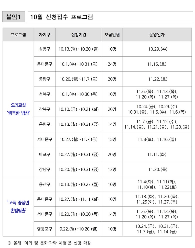 해당 프로그램은 서울시에 거주하거나 서울시가 생활권인 40세~67세의 1인가구라면 누구나 참여할 수 있으며, 11월까지 참가자를 수시로 모집 중이다. 자세한 프로프로그램 내용·일정 확인과 신청은 서울1인가구 누리집(1in.seoul.go.kr)에서 할 수 있다.