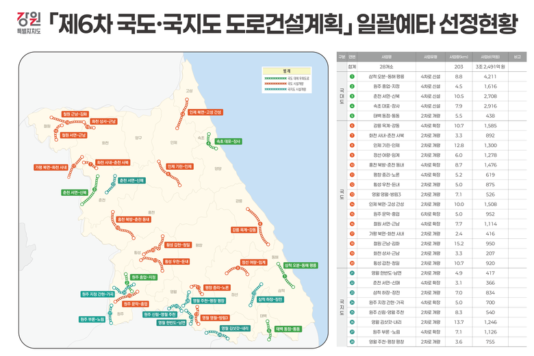 ○ 제6차 국도‧국지도 도로건설 사업계획 1차 평가에서 역대 최다, 전국 평균 이상 선정 [강원도 세계타임즈=김민석 기자] 강원특별자치도(도지사 김진태, 이하 ‘도’)가 지난 1월 23일 영월~삼척고속도로 예비 타당성 통과에 힘입어 민선 8기 김진태 도정의 핵심 목표인 ‘사통팔달 강원시대’ 실현을 위한 2025년도 도로사업 주요 추진 계획(12개 사업, 34조 원 규모)을 발표했다.