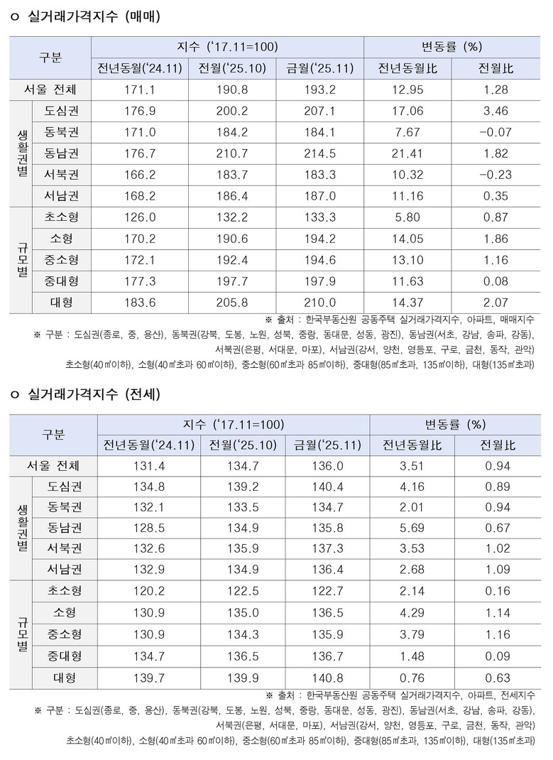 11월 실거래가격지수는 2025년 11월 1일부터 30일까지 체결된 매매계약 중 부동산 거래신고 등에 관한 법률에 따라 계약체결일로부터 30일 이내 신고가 완료된 실거래 자료 전수를 분석해 산출했다.
