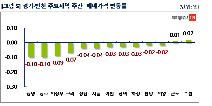 경기ㆍ인천은 ▼광명(-0.10%) ▼광주(-0.10%) ▼의정부(-0.09%) ▼구리(-0.07%) ▼성남(-0.04%) ▼시흥(-0.04%) 순으로 떨어졌다. 광명은 누적된 매물들이 장기간 해소되지 못하면서 집주인들이 호가를 내리는 분위기다. 철산동 주공12단지와 철산래미안자이가 500만원-2,500만원, 하안동 주공5단지와 광명두산위브트레지움이 250만원-500만원 하락했다. 광주는 오포읍 신현1차현대모닝사이드와 쌍용2차가 250만원-1,250만원 떨어졌다. 반면 △수원(0.02%) △군포(0.01%) 등은 소폭 상승했다. 수원은 호매실동 호매실능실마을20단지가 1,000만원 상승했다.