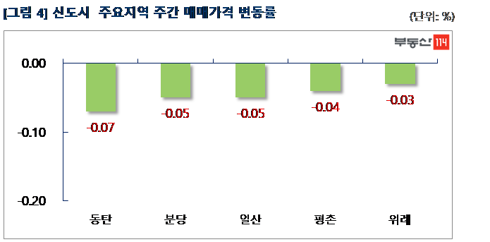 신도시는 ▼동탄(-0.07%) ▼분당(-0.05%) ▼일산(-0.05%) ▼평촌(-0.04%) ▼위례(-0.03%) 순으로 하락했다. 장기간 거래시장이 침체로 급매물이 늘어나는 분위기다. 동탄은 반송동 시범한빛한화꿈에그린, 시범한빛금호어울림이 1,000만원-1,500만원 떨어졌다. 분당은 분당동 장안건영, 서현동 시범삼성·한신, 야탑동 장미현대 등이 500만원-2,500만원 하락했다.