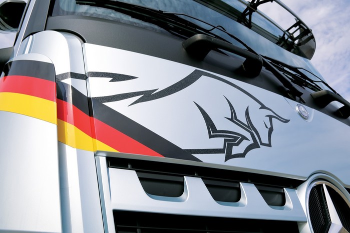 새롭게 선보이는 아록스 덤프 실버 불(Arocs Tipper Silver Bull)에는 차량 전면부에 역동적인 황소와 독일 기술의 DNA를 상징하는 스페셜 데칼이 적용되어 한층 더 강인하고 고급스러운 외관을 연출한다.