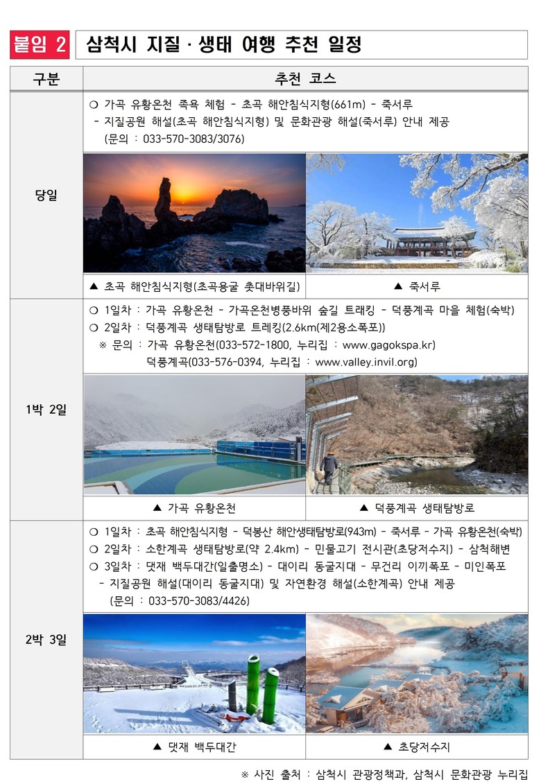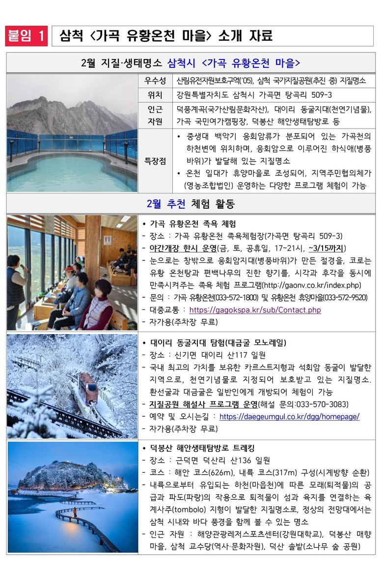 ▶ 2월 중 야간 족욕 프로그램, 유황 천연 비누 만들기 등 이색 놀거리 제공 [강원도 세계타임즈=김민석 기자] 강원특별자치도(도지사 김진태, 이하 ‘도’)는 2025년 2월 지질·생태명소로 삼척시의 <가곡 유황온천 마을>을 선정했다고 밝혔다.