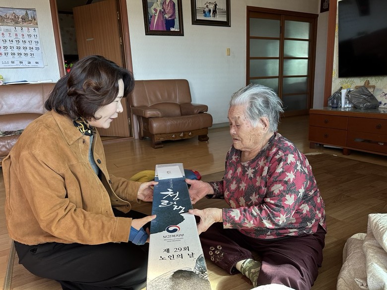 [강화군 세계타임즈=심하린 기자] 강화군 화도면(면장 조순이)은 지난 27일, 100세를 맞이하신 장화1리 정애인 어르신께 건강과 장수를 상징하는 장수 지팡이 ‘청려장(靑藜杖)’을 전했다고 밝혔다.